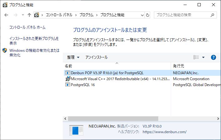 PostgreSQLをアンインストールしていない場合は、Denbun POP版のインストールで作成したPostgreSQLのデータベースとユーザーを削除します。