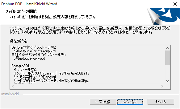 PostgreSQL管理者ユーザーのユーザー名とパスワード入力した後、「次へ」ボタンを押してください。