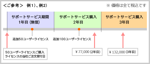 サービス期間途中にライセンスの追加購入を行い、サービス料金に変更が生じた場合、追加後の新サービス料金の適用は翌年度のサポートサービス購入時からになります。